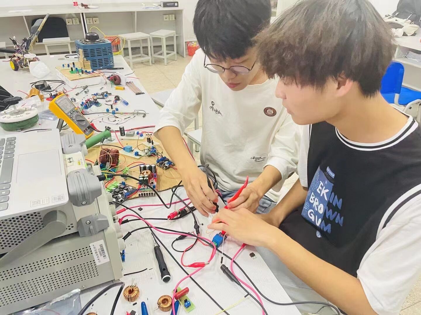 本次比赛自7月27日8时正式开始,16支参赛队伍在大创基地的封闭实验室内开展方案设计、理论推导、仿真验证、硬件电路搭建、软件设计编程、系统调试等。经过四天三夜高强度的电子系统设计与制作,7月30日晚10点前所有队伍完成了竞赛作品和设计报告,并于8月1日顺利完成了参赛作品的线上评测。比赛共有6个赛题,内容涉及单相交流电子负载、送货无人机、小车跟随行驶系统、混沌信号发生器、声源定位跟踪系统、信号调制度测量装置,每个赛题都带有很强的综合性、设计性、工程性和挑战性,重点考察参赛同学的电路设计能力和编程能力。物联学子凭借扎实的专业知识、良好的创新设计能力和优秀的团队合作意识,按照大赛要求顺利完成了作品设计和制作,取得了佳绩。