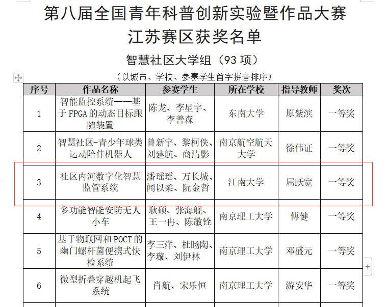 近日,第八届全国青年科普创新实验暨作品大赛(江苏赛区)决赛在南京科技馆落下帷幕,共有来自30所高校、95所中学的2700余人参与赛事活动。经各赛项初赛、复赛评审及现场比赛等环节的激烈角逐,物联网工程学院作品“社区内河数字化智慧监管系统”获评一等奖,并成功推荐至国赛(全省仅六项)。