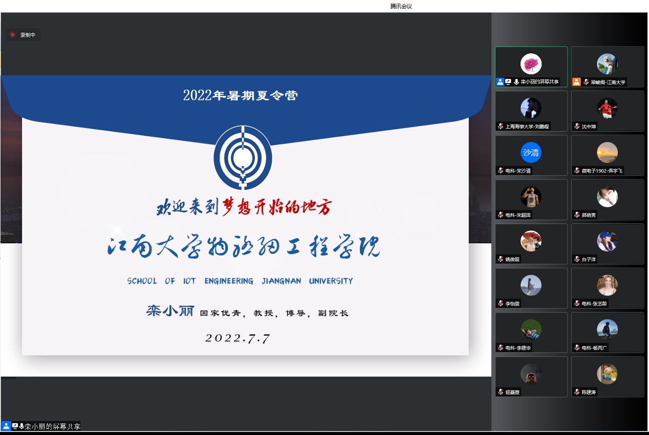 上午9点,夏令营举行了线上开营仪式,物联网工程学院副院长栾小丽教授、学院相关学科负责人、全体参营学生参加了活动。栾小丽副院长首先对参加本届夏令营的同学表示了热烈欢迎,随后就学院历史沿革、学科平台、师资情况、奖助体系、国际交流、研究生培养、就业情况等方面进行了全面介绍,详细说明了学院各学科的特色和优势,并就研究生阶段的学习、研究方向、导师选择等进行了充分的介绍和交流。