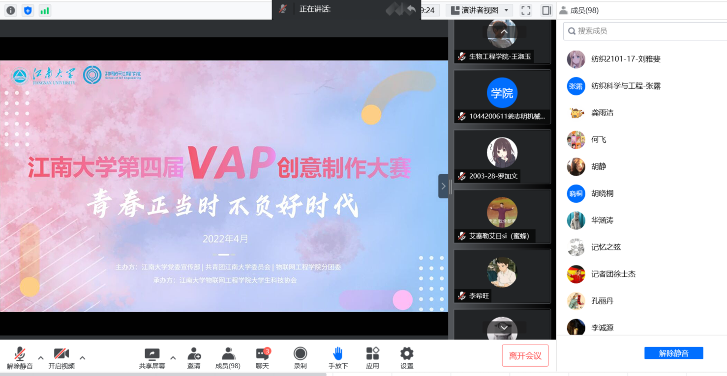 第四届VAP创意制作大赛决赛在线上成功举行。物联网工程学院党委副书记、副院长孔丽丹,校党委宣传部网络思政与宣传科科长张铁根,物联网工程学院分团委书记洪筱,物联网工程学院辅导员王志顺、王雪冰、屈跃宽、沈滔出席本次活动并担任评委。