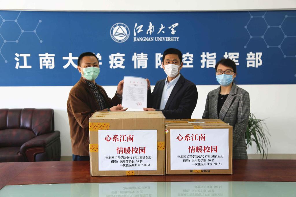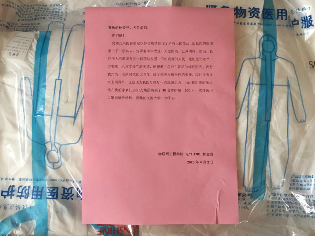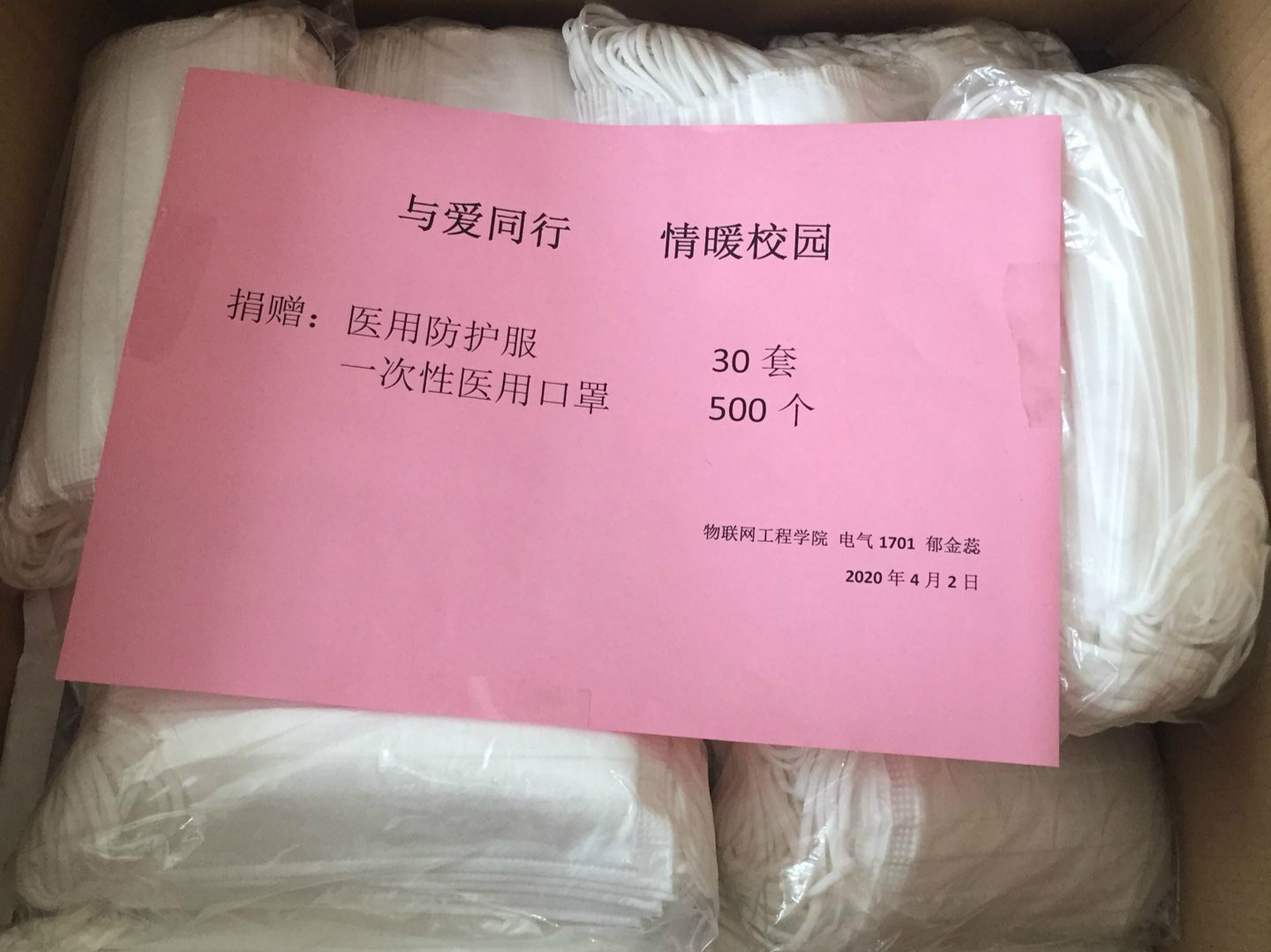 师生的健康和安全,电气1701班的郁金蕊同学无偿为母校捐赠30套防护服和500只一次性医用口罩,用自己的实际行动为母校的疫情防控工作助力。