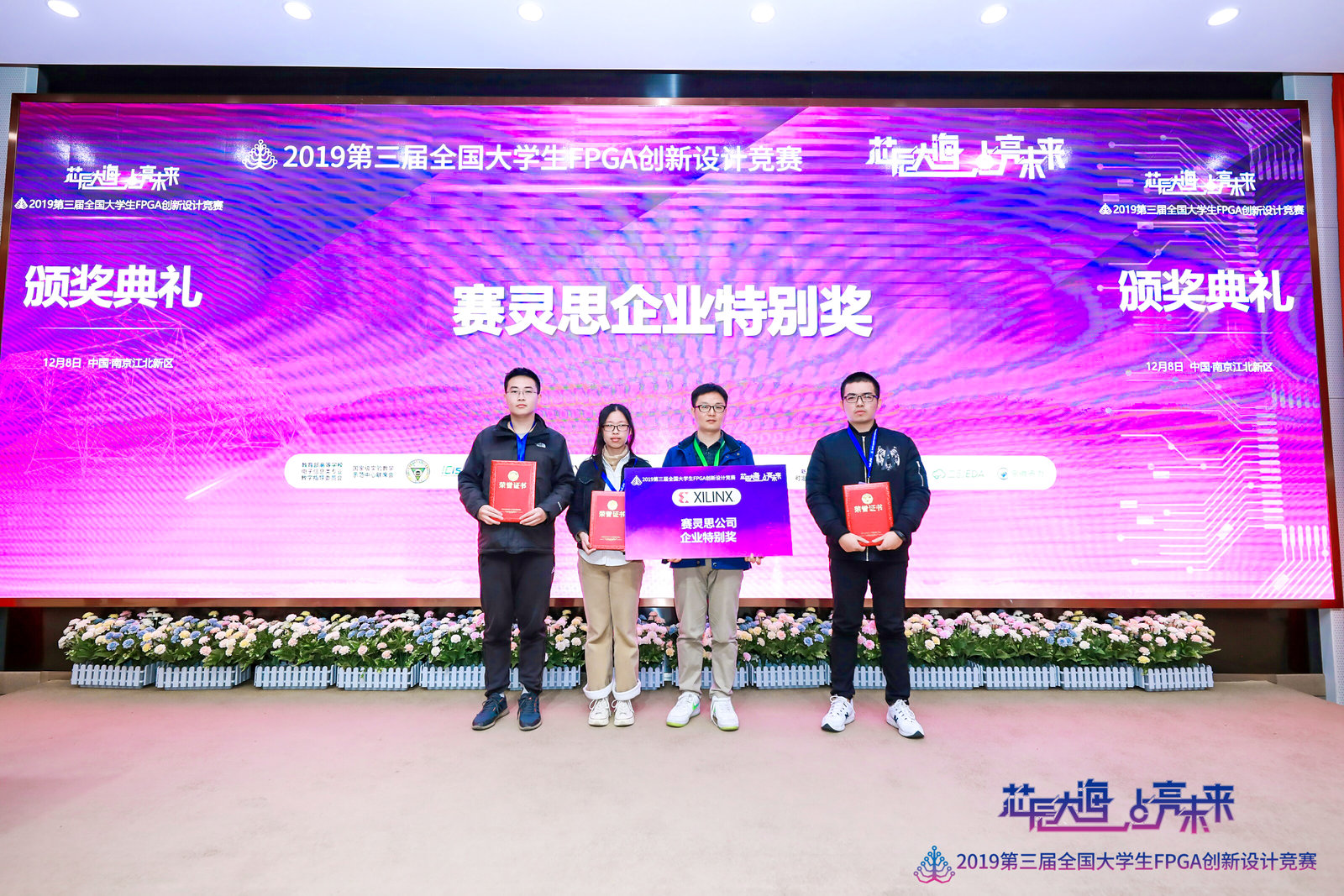 参加了该赛事,参赛队员由物联网工程学院研究生张新伟、李康、郁龚健、刘家航组成。经过激烈竞争,参赛作品“基于FPGA的类脑计算平台”斩获特等奖,并获得全球最大的FPGA提供商Xilinx的企业特别奖。