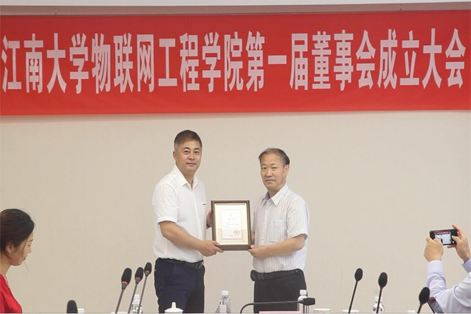 和校董事会致辞。他介绍了学校近年来的发展概况以及取得的成绩,肯定了物联网工程学院在学校整体快速发展过程中做出的积极贡献,向长期以来关心支持学校发展的各企业单位表示衷心的感谢。他指出,学校和学院的快速发展,离不开饱含社会责任、桑梓情怀的行业翘楚和社会贤达的鼎力支持,希望物联网工程学院董事会,紧密围绕产业发展需求,加强产教融合协同创新,推动教育链、人才链与产业链、创新链有机衔接,形成企业与学校同频共振、联手联动的产教融合发展新格局,为实现党代会提出的“世界知名、中国一流、江南风格的研究型大学”的奋斗目标,作出新的更大贡献。