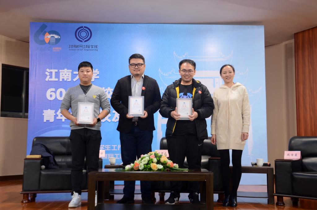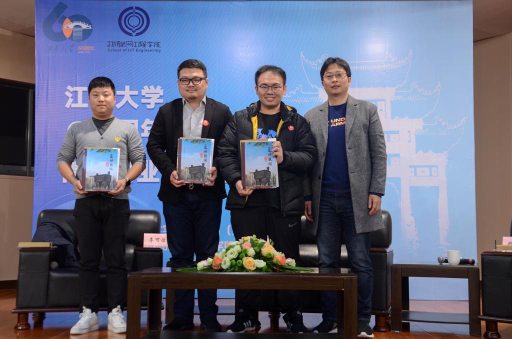 最后,程捷音为三位校友颁发物联网工程学院创业导师聘书,陈琳代表学校向三位校友赠送60周年校庆纪念品。