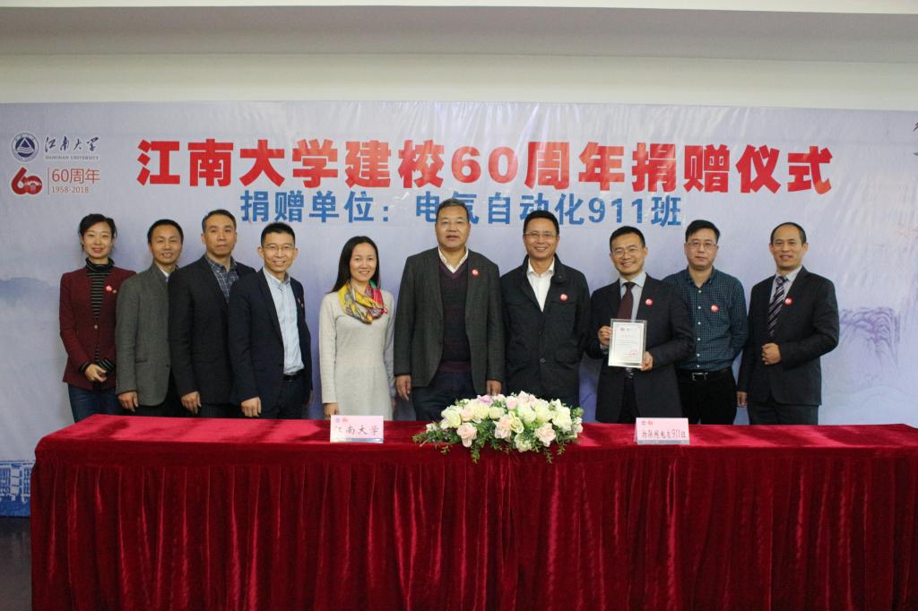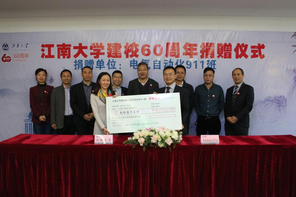 物联网工程学院电气自动化911班捐赠仪式在文浩馆105举行。电气自动化911班代表——宁波睿驰塑业有限公司总经理郑成坚、上海祥树欧茂机电设备有限公司总经理赵树才、平安银行平安信用卡中心副总裁俞如忠;93级校友代表、上海锡明光电有限公司总经理王振宇,以及黄漫