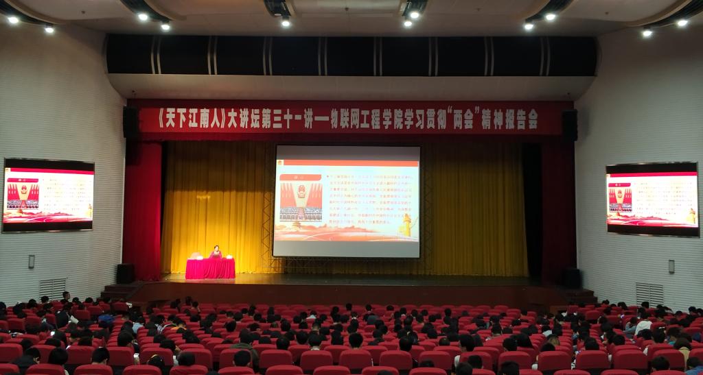 4月25日,“天下江南人大讲堂”第三十一讲暨物联网工程学院学习贯彻“两会”精神报告会在文浩馆观众厅举行。全国人大代表、全国三八红旗手、物联网工程学院校友、无锡威孚高科技股份有限公司汽车零部件事业部工程部经理赵伟就全国两会概况和热点问题作了精彩报告。本次活动由物联网工程学院联合社会资源处举办,物联网工程学院党委书记程捷音、社会资源处副处长窦新华出席了活动。报告会由物联网工程学院党委副书记耿向阳主持,物联网工程学院2017级本科生和硕士生近千人聆听了报告。