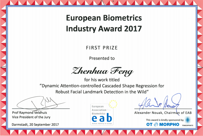 物联网工程学院模式识别与计算智能国际联合实验室的博士后研究人员冯振华喜获2017年欧洲生物特征识别工业奖(European Biometrics Industry Award 2017)。