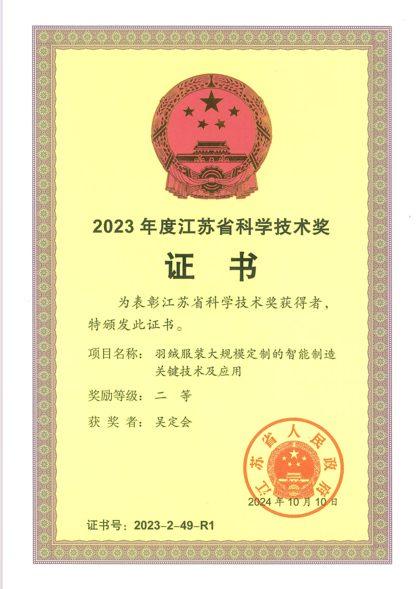 物联网工程学院吴定会教授牵头完成的“羽绒服装大规模定制的智能制造关键技术及应用”项目荣获江苏省科学技术奖二等奖。