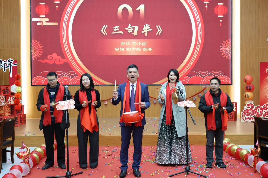 活动在精彩的开场视频中拉开序幕。学院过去一年的辉煌成就历历在目,老师们的辛勤付出和学院的蓬勃发展令人倍感振奋。随即,学院领导班子以一段幽默风趣的《三句半》表演率先登场,生动总结了上一年度的工作亮点,同时向全体教职工送上真挚的新年祝福,瞬间点燃全场热情。