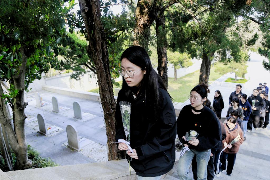 师生们在烈士墓区瞻仰沉思