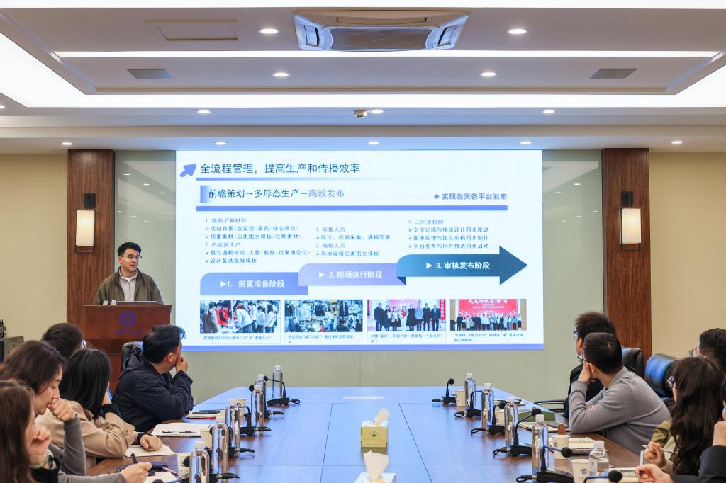 会上,各学院结合自身工作实际,围绕近期重点活动、特色工作和典型选题依次作交流汇报。校融媒体中心结合学校近期宣传规划,就校园热点策划、专题宣传组织和典型人物深度挖掘等内容和与会人员进行了交流探讨。