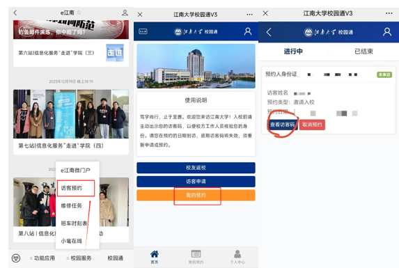 手机关注“e江南”微信公众号,点击屏幕下方“校园服务”中的“访客预约”,进入后点击“我的预约”,点击“查看访客码”即可获得访客码。进入校园时出示访客码。