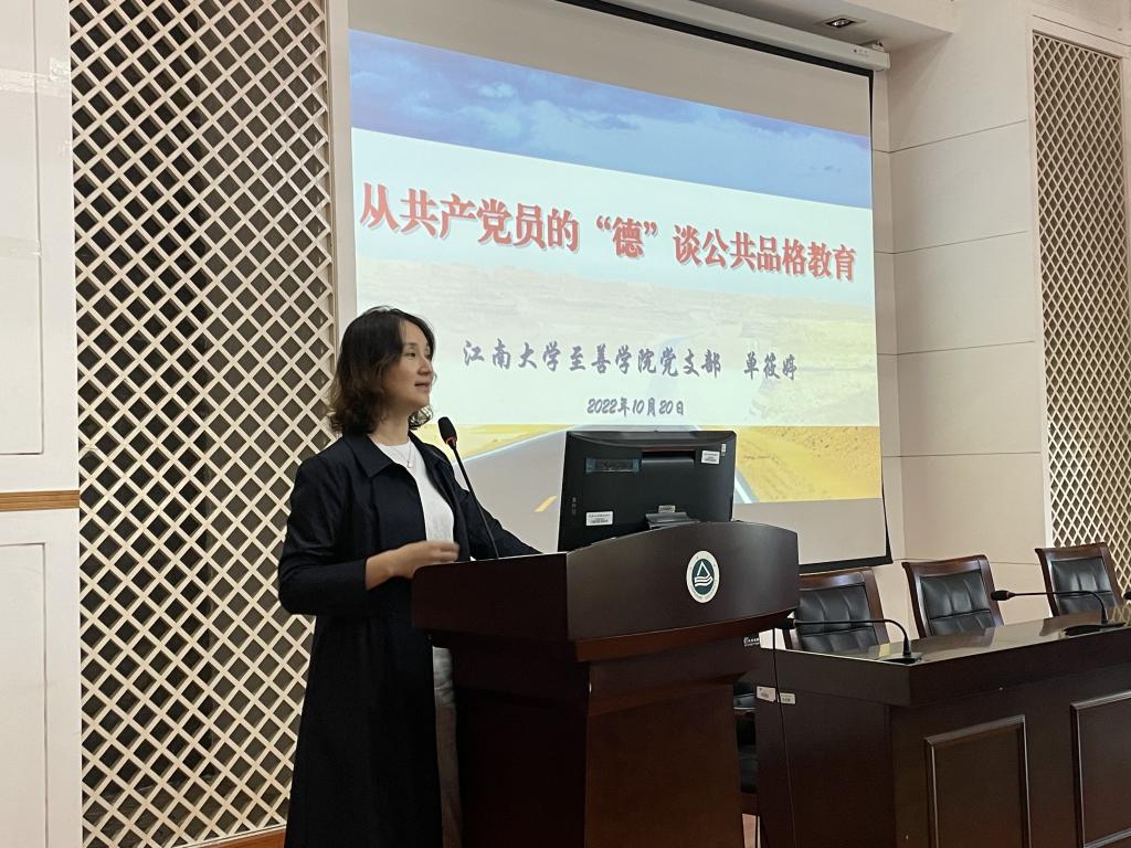 10月20日下午,物联网工程学院党委特邀至善学院副院长单筱婷讲授“从共产党员的‘德’谈公共品格教育”主题党课。学院150余名师生在学院D328会议室聆听了本次党课。活动由辅导员李灿主持。