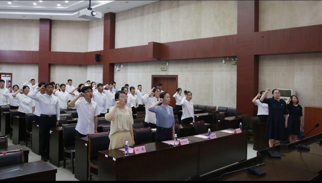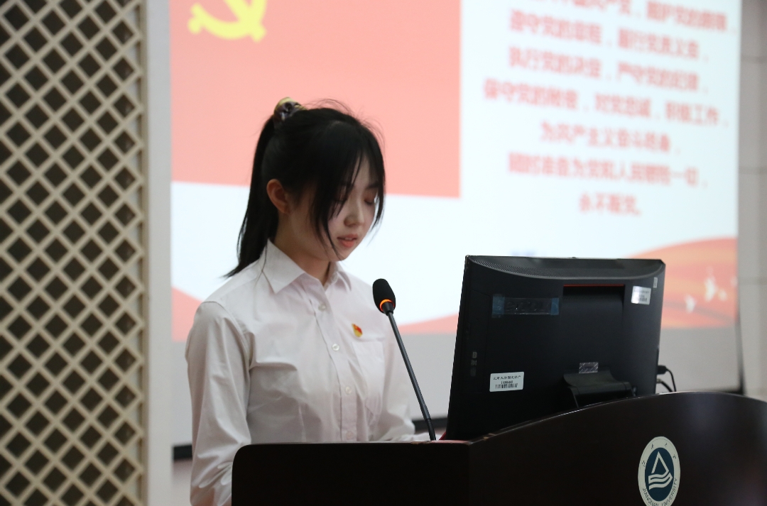 宣誓仪式在雄壮的《国际歌》中拉开序幕。程捷音、孔丽丹为新党员代表佩戴党员徽章、赠送党史读物。随后,孔丽丹带领44名新党员面向党旗庄严宣誓,在场的老党员代表也一同重温了入党誓词,全体党员在党旗下接受心灵的净化和洗礼,铮铮誓言表明了各位党员牢记政治责任和历史使命,为共产主义事业奋斗终生的决心。
