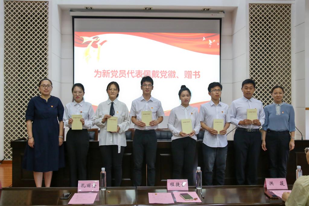 党委领导为新党员佩戴党员徽章、赠书