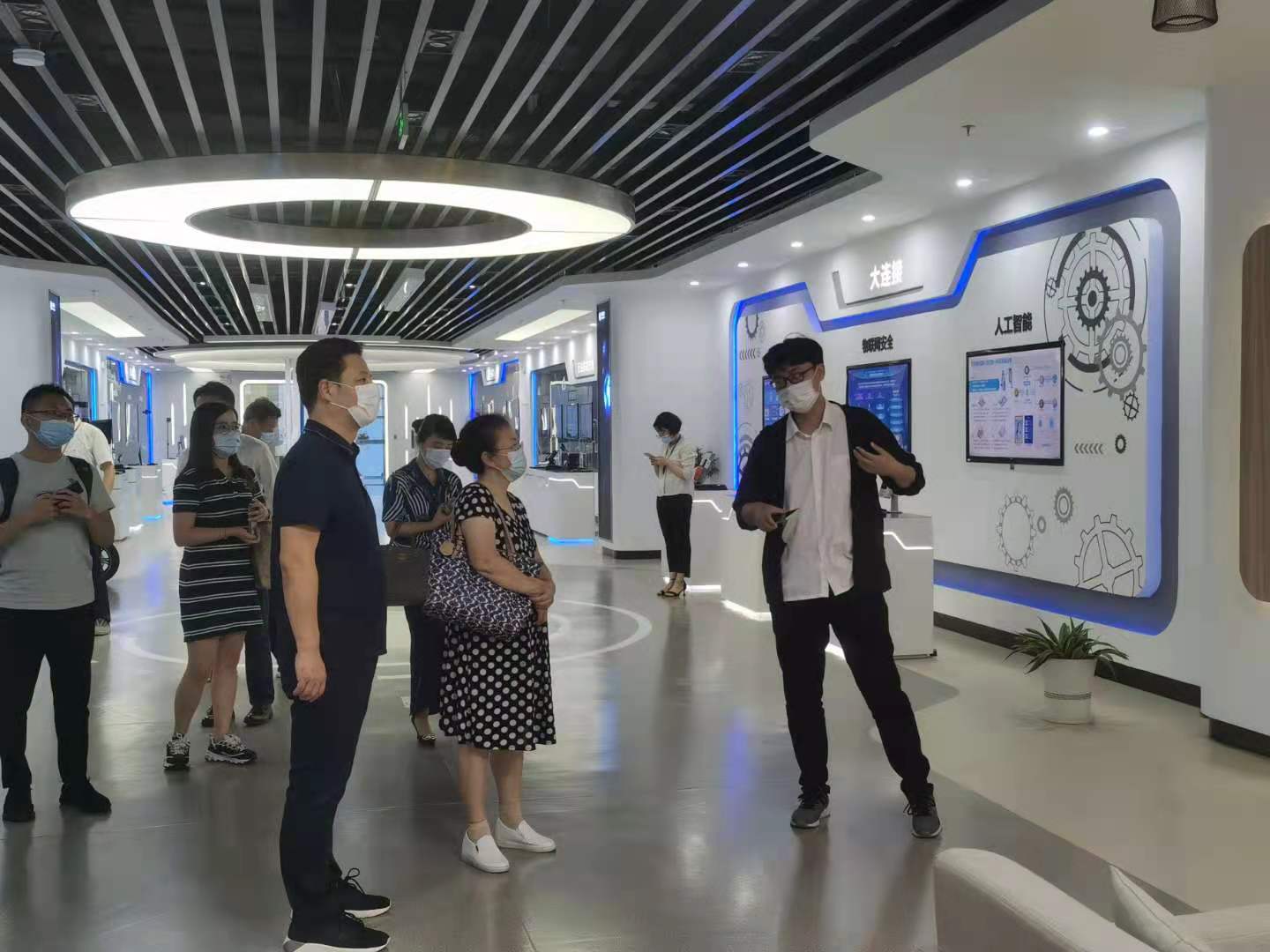 会前,支部成员和其他与会人员在中国移动无锡市公司相关领导和技术骨干的带领下,参观了中国移动5G体验中心,了解了大数据、云计算、5G核心能力、全域旅游智慧监管平台、无锡市公安局“锡康码”平台、5G远程医疗应用示范场景,智能制造、数字家庭生态圈等方面的情况。