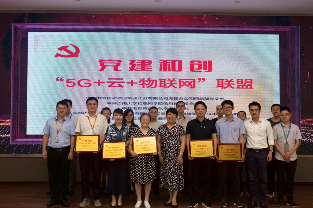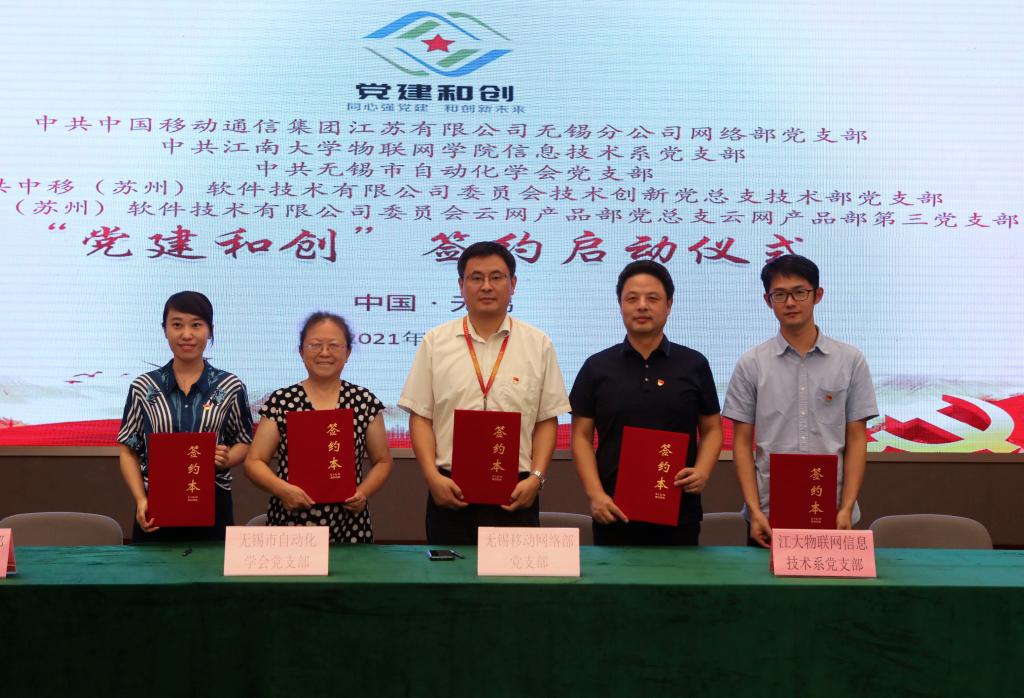 物联网工程学院信息技术党支部联合无锡市自动化学会党支部、中国移动通信集团江苏有限公司无锡分公司网络部支部委员会、中移(苏州)软件技术有限公司委员会云网产品部党总支云网产品部第三党支部、中移(苏州)软件技术有限公司委员会技术创新党总支技术部党支部,联合开展了“5G+云+物联网”联盟党建和创主题实践活动,现场完成了揭牌仪式和签约。