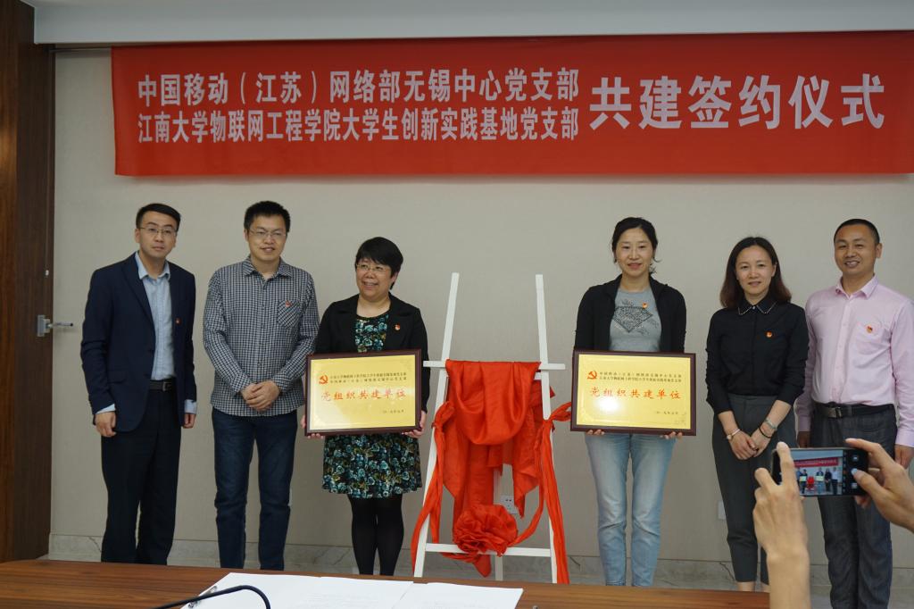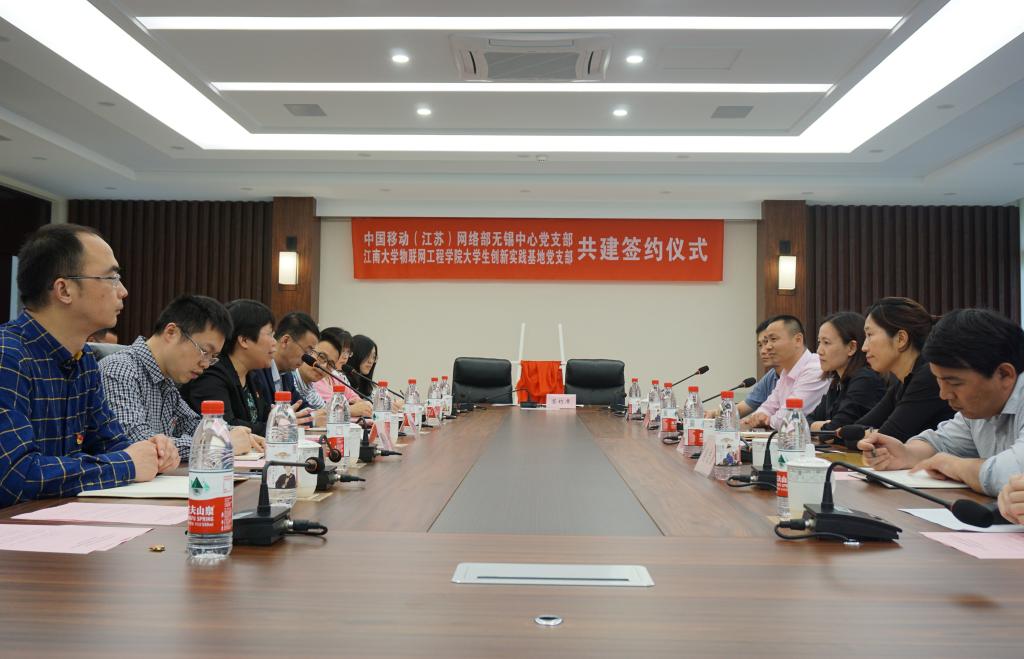 物联网大学生创新实践基地党支部与江苏省移动网络部无锡中心党支部共建签约仪式在物联网工程学院B222会议室举行。江苏移动网络部无锡中心网络部总工程师兼维护中心主任、党支部书记陈瑛,无锡维护中心增值网室经理、组织委员秦磊,无锡维护中心增值网室副经理、宣传委员葛良;黄漫