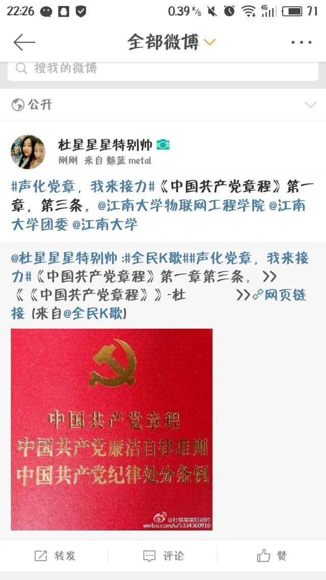 在“声”化党章党日活动中,指导学生党员朗诵党章党规并制作成小音频上传网络,并@物联网学院、黄漫