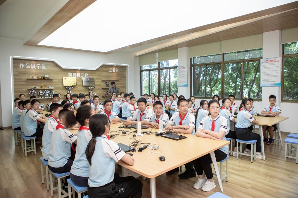 在2023年全国大学生智能汽车竞赛上斩获全国一等奖的陈基浩、张海涛、胡宸恺同学也来到了格致中学,为学生们介绍了自主研发的独轮车、越野单车和城市水道清障机器人的外观设计、工作原理等。在看到智能车可以轻松实现自立、转向、避障等目标功能后,学生们在赞叹科技神奇的同时,更加坚定了向榜样学习、未来投身科研的信心和决心。