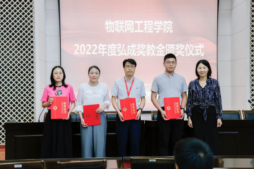 弘成奖教金是由弘成科技发展有限公司设立,旨在奖励为学院发展建设做出重要贡献或取得突破性、标志性成果的个人和集体,分别设有党建创新奖、科技突破奖、教育教学奖、管理服务奖、校园文体奖等奖项。2022年度“弘成奖教金”共设一等奖4项、二等奖8项、三等奖12项,其中,一等奖分别授予大学生创新实践基地党支部(入选全国党建样板支部)、“物联网技术应用”教育部工程研究中心(通过评估并获良好等级)、许德智老师(荣获国家优秀青年科学基金)和院乒乓球队(荣获黄漫