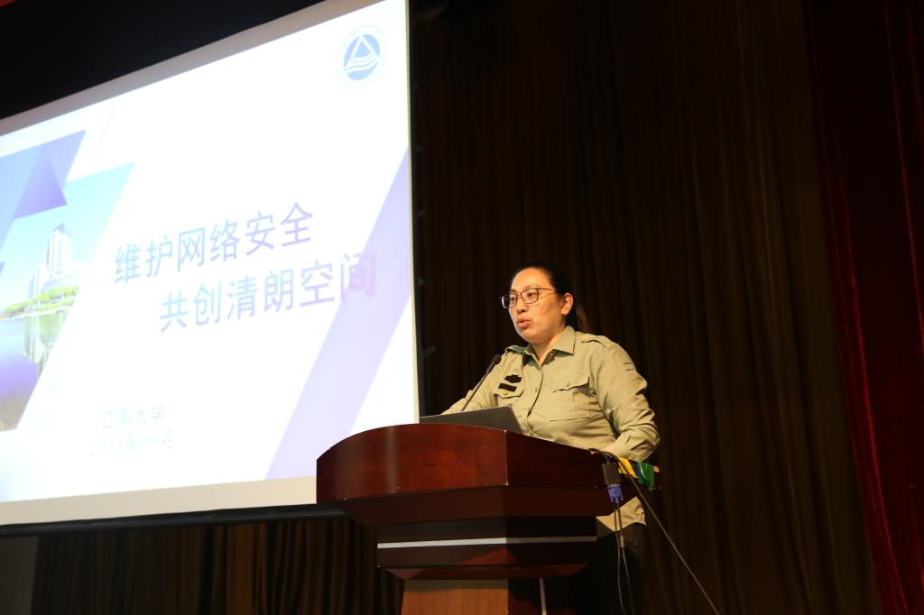 孔丽丹首先对2023级新同学表达了热烈的欢迎和祝贺,并作“维护网络安全,共创晴朗空间”主题讲座。她从网络安全相关法律法规入手,告诫学生互联网不是法外之地、互联网不是虚拟空间;以真实案例为警示,强调维护校园网络安全和网络文明的重要性;以黄漫