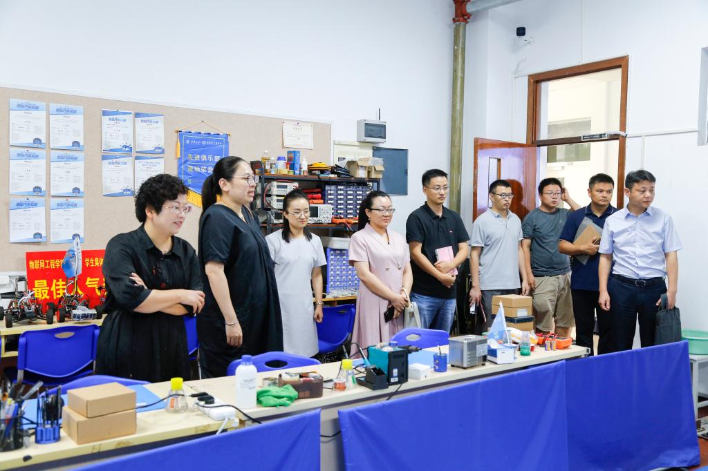 会后,经开区教育局一行参观了物联网大学生创新实践基地,实地了解学院大学生创新实践重点项目和取得的成果,并与基地学生进行了现场交流。