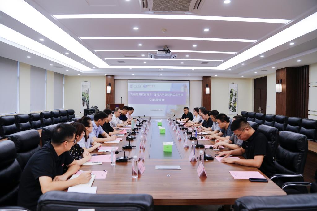8月23日,无锡市经开区教育局赴物联网工程学院开展合作交流活动。无锡市经开区教育局党委书记、局长杨柳,党委委员、副局长钱柯,党委委员、教师发展中心主任徐卫忠,物联网工程学院党委副书记孔丽丹、副院长郭亚,信息技术系教授吉训生、秦宁宁等参加交流活动。活动由郭亚主持。