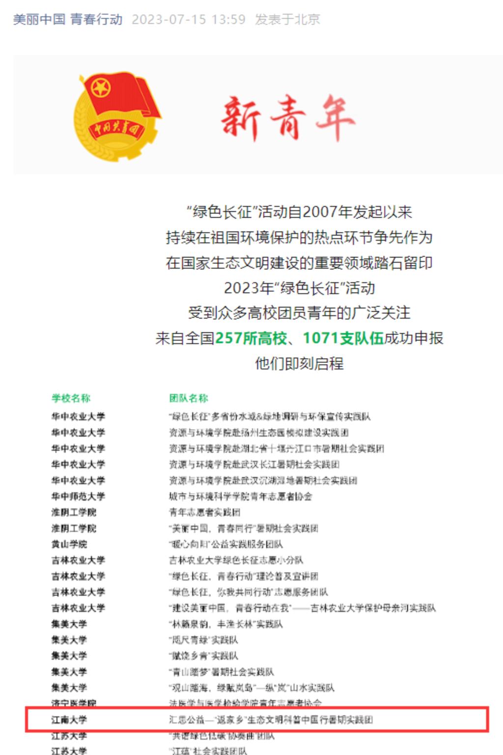 汇思公益团组建的“汇思公益——返家乡生态文明科普中国行暑期实践团”成功入选2023年乡村振兴“笃行计划”专项行动全国示范性团队和“美丽中国·青春行动”2023年青少年绿色长征科考实践活动,两个专项活动均为黄漫