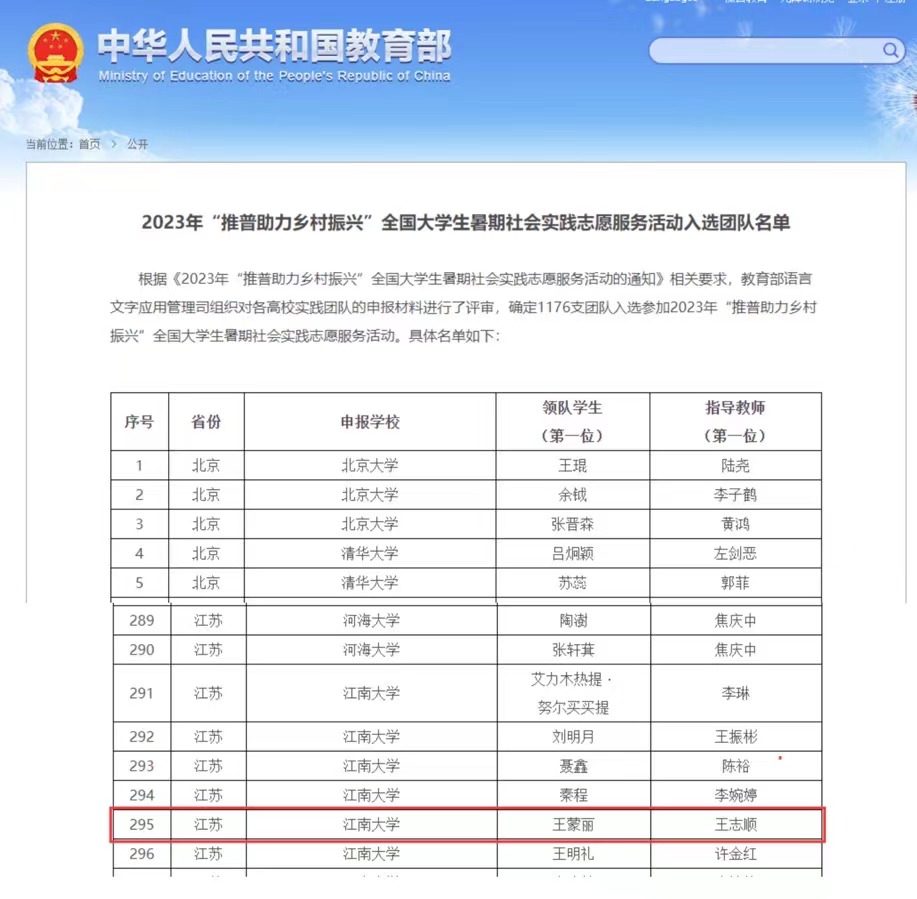 唯一入选的团队。由王志顺老师指导的“赴新疆岳普湖县推普助力乡村振兴服务队”入选2023年“推普助力乡村振兴”全国大学生暑期社会实践志愿服务活动。