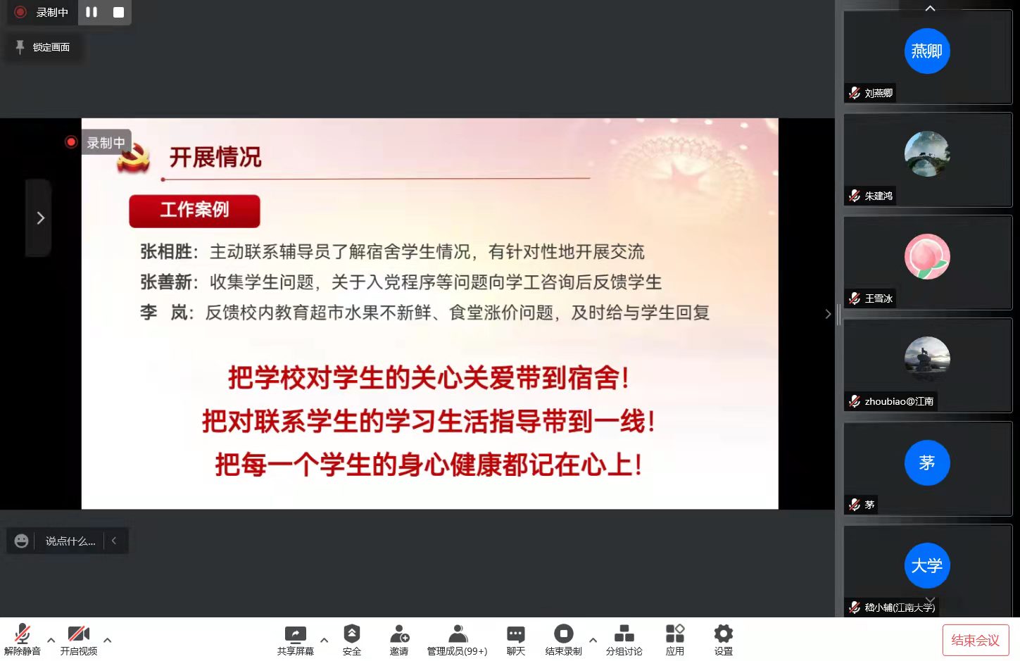 程捷音在发言中进一步强调了对接联系工作的重要性。她从无锡市疫情防控形势出发,结合学校应急26号文的通知精神,详细解读学校当前防控要求。她指出,校园封闭管理政策下,对在校学生的关心、教育是当前非常重要且迫切的任务,学院党员教师一定要提高政治站位、践行责任担当、悉心陪伴学生,成为学校抗疫的坚实力量。同时,她要求有条件进校的教师深入学生中开展走访交流,其他老师先在网络平台建立联系,灵活运用不同形式、途径进行对接。希望通过这项工作的开展,全院教职工能够把每一个学生的身心健康记在心间,把学校对学生的关心关爱送进宿舍,把对联系学生的学习生活指导带到一线!