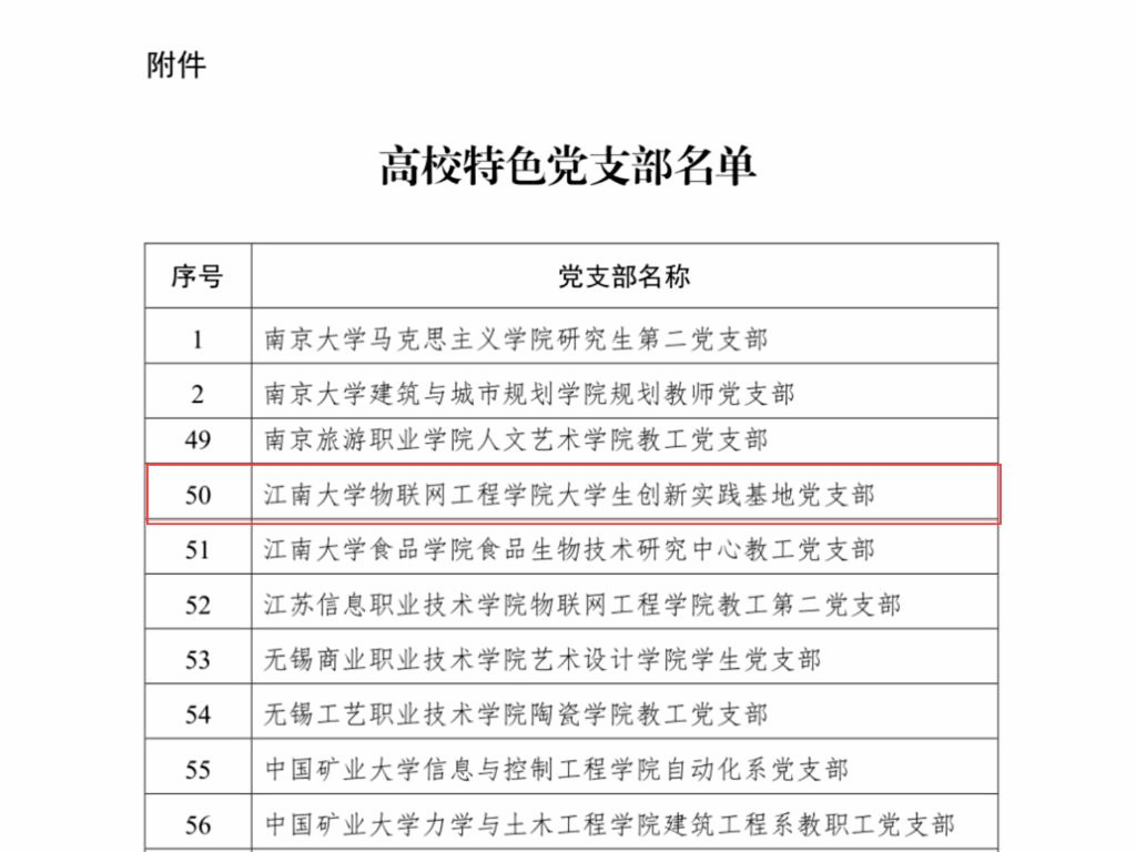 近日,江苏省委教育工委特色党支部遴选结果揭晓,物联网工程学院大学生创新实践基地党支部入选江苏高校特色党支部。