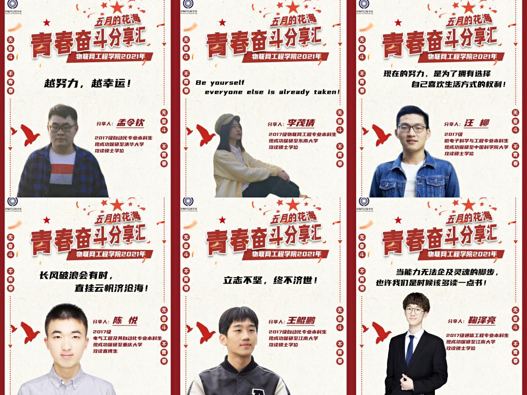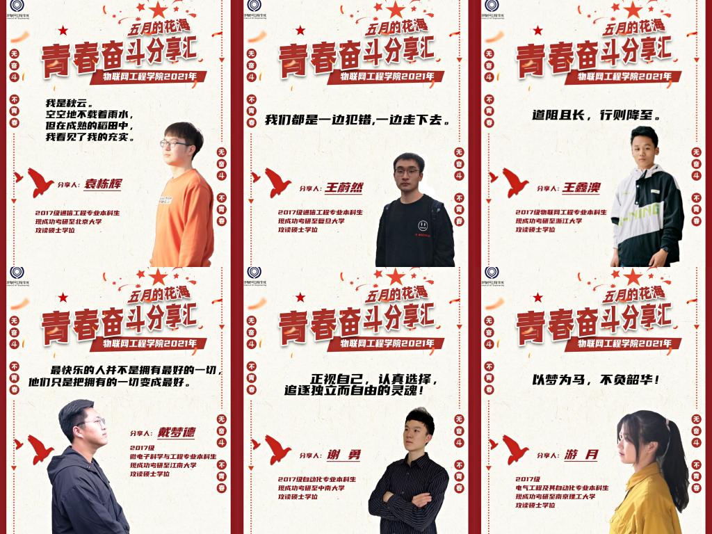 为弘扬五四精神,树立青年榜样,激发广大物联学子奋进有为,物联网工程学院结合五月主题教育,成功举办第二届“五月的花海”青春奋斗分享汇系列活动。本届青春奋斗分享会分别于4月21日、4月26日举行保研、考研分享专场,共邀请12位青年学生代表作为分享嘉宾,以“讲述青春故事,分享升学感悟”为主题,通过面对面的分享形式,讲述物联学子的备考历程、心态调整、成功经验和心得体会,向物联学子展现身边优秀青年的奋斗风貌,为广大的物联学子明确努力目标、指引奋斗方向。