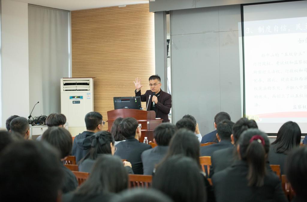 他以“疫情防控中,有两个战场,一个是现实防控的战场,一个是意识形态的舆论场”为观点出发,旁征博引讲诉了舆论主动权在国家应对危机中的重要意义。并从依赖人民、动员群众及引领青年等角度,以党的群众路线、共产主义的双重维度、集中力量办大事的制度优势以及家国天下的文化厚度等为切入点,系统阐述了中国特色社会主义道路自信、理论自信、制度自信和文化自信的丰富内涵,对于同学们深刻理解中国共产党的宗旨和目标、辩证看待民主、以及正确认识大国外交给予极大启迪。这堂课不仅内容上理论扎实、内容详实、逻辑缜密,唐老师风趣的语言和明快的语速、接地气的事例和掷地有声的观点,也深深吸引了同学们跟随他的话语和思想与信仰共鸣。作为“宝哥说”的主讲人,唐忠宝老师的思政课一票难求,这种近距离的思想碰撞,对于激发青年学子对理想信念的思考和认识,塑造正确的人生观、价值观、世界观起到了催化剂的作用。