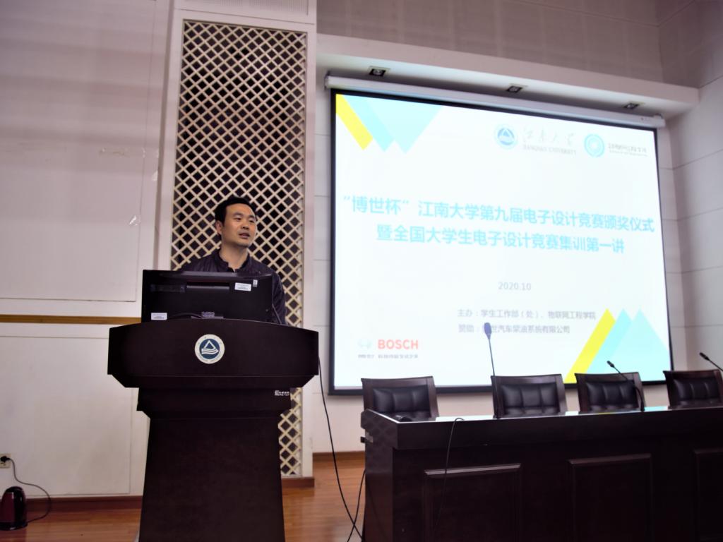 第九届电子设计竞赛颁奖仪式暨全国大学生电子设计竞赛集训班开班第一讲在物联网工程学院D328举行。博世汽车柴油系统有限公司卓越经营推进部部门经理贾文华,物联网工程学院党委副书记、副院长孔丽丹,院分团委书记吴垚,电子设计竞赛指导教师孙顺远、张伟、王子赟、朱凯元,全体校赛和省赛参赛队员及电子设计俱乐部新成员出席了本次仪式。