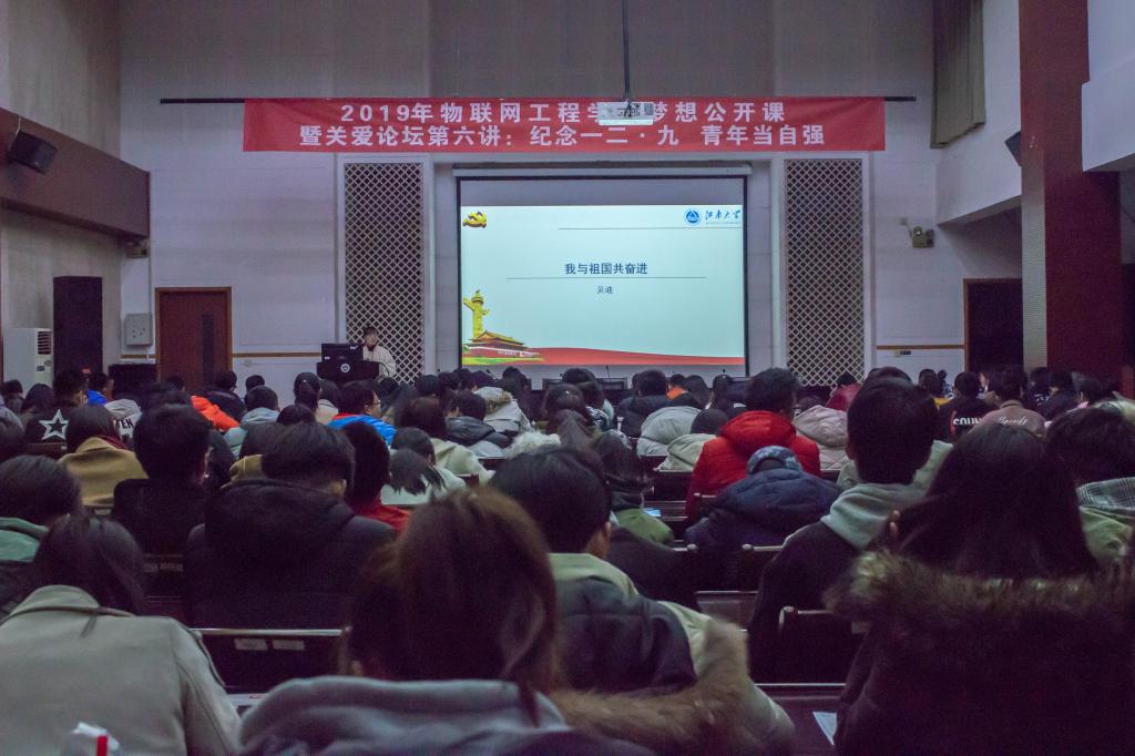 物联网工程学院2019年梦想公开课暨“我和我的祖国”关爱论坛第六讲在学院D328报告厅顺利举行。本次活动以“纪念‘一二·九’运动84周年”为主题,由学院分团委书记吴垚,分团委宣传委员、辅导员吴迪主讲,学院第十届“青年马克思主义者培养工程”训练营营员及第10期入党积极分子培训班的学员共150余名学生参加了本次活动。