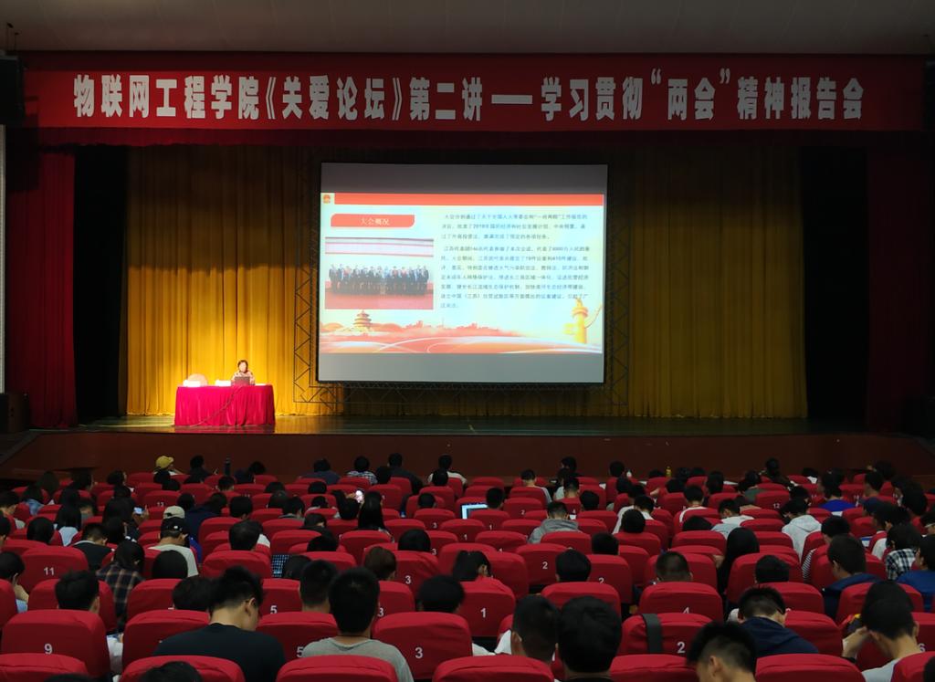 建校60周年优秀校友、无锡威孚高科技股份有限公司汽车零部件事业部工程部经理赵伟就今年全国两会召开的盛况及新出台的重大政策作了精彩报告。本次活动由物联网工程学院关工委举办。报告会由物联网工程学院党委副书记耿向阳主持,物联网工程学院2018级本科生和硕士生近千人聆听了报告。