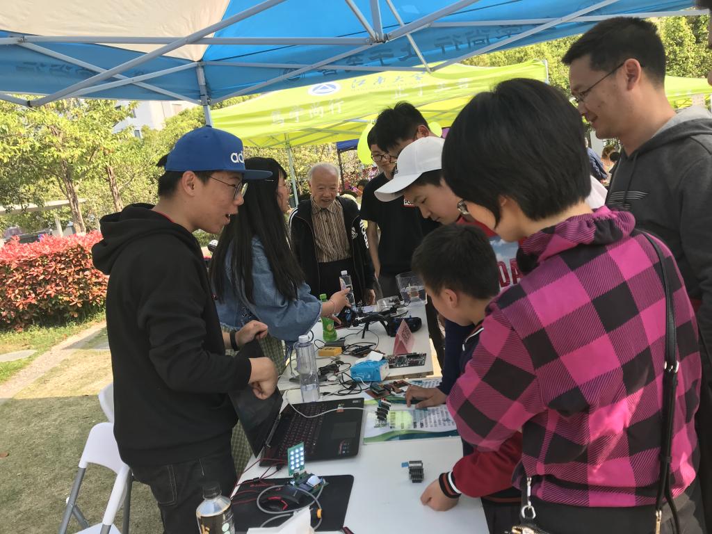 同学热情地给前来参与的大朋友和小朋友们讲解了这些展品其中的原理、工作方式和可以实现的功能。相信通过此次活动能够在小朋友心中种下一颗科学的种子,它在将来会长成参天大树。