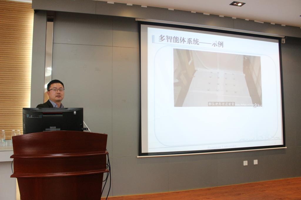 会议最后是由特邀嘉宾作主题报告。物联网工程学院教授、博士生导师刘成林作了“关于多智能体系统协调控制”的报告,他从生活中常见的示例讲起,循序渐进,向大家详细介绍了多智能体系统的协调控制问题,前来参会的同学收获颇丰。