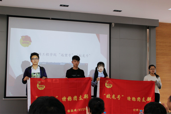 “新老交替,薪火相传”。“蛟龙号”、“远望号”特称团支部团旗交接仪式在激昂的音乐声中正式开始。2016级“蛟龙号”、“远望号”特称团支部书记从2014级“蛟龙号”、“远望号”特称团支部书记手中接过了鲜艳的团旗,会议也在阵阵掌声中被推向高潮。授旗仪式过后,“蛟龙号”特称团支部——计科1605班团支部书记郭歌代表新一届特称团支部发言。他在发言中承诺,新一届特称团支部将继续继承发扬“蛟龙精神”和“远望精神”,为特称团支部的辉煌史再添上浓重的一笔。同时,为了更好地建设特称团支部,物联网工程学院分团委还为大一、大二特称团支部聘请了指导老师,此次的交接仪式上也为新的指导老师授予了聘书。