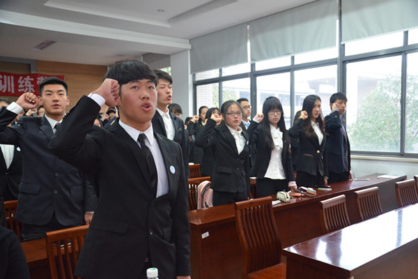 然后,团务中心傅伟聪同学上台向各位领导、营员介绍本此次训练营的策划思路,实施方案和具体课程安排。在主持人的介绍下,礼仪小姐在台前向与会人员展示前辈们精心设计的营旗。主持人介绍了营旗的组成和其设计的内涵,同时,团务中心负责人向各位营员发放了印有营旗的徽章。在欢笑声中,五位到场嘉宾亲手为五位营员代表佩戴了徽章。这样的一幕,意味着传承,预示着起航,大家憧憬的目光中透着的是无穷无尽的希望。随后,仪式在营员代表傅慧榕的发言与营员的集体宣誓中落下帷幕。