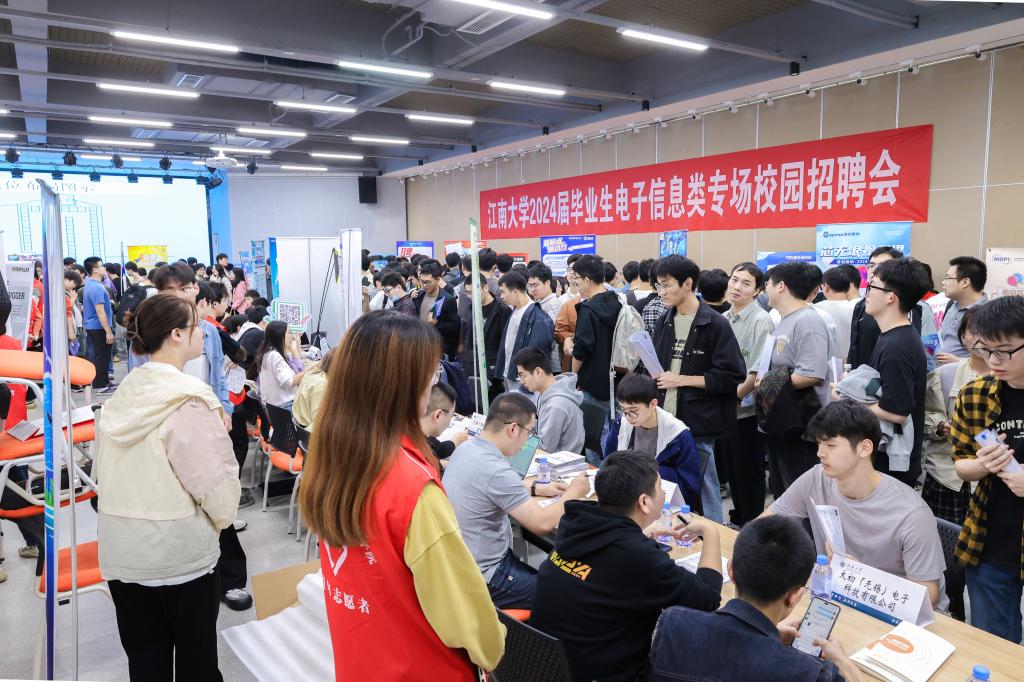 2024届毕业生电子信息类专场校园招聘会在北区大学生活动中心招聘大厅举办。本次招聘会由物联网工程学院和人工智能与计算机学院联合举办,汇聚中国电科、理想汽车、华润微电子、博世、卡特彼勒、中科曙光等龙头领军企业、科研院所、事业单位等用人单位54家,提供优质就业实习岗位2000余个,招聘专业涉及电气工程、自动控制、集成电路、计算机、软件工程等众多电子信息专业领域,涵盖本、硕、博各学历层次,吸引800余名学生到场参加。