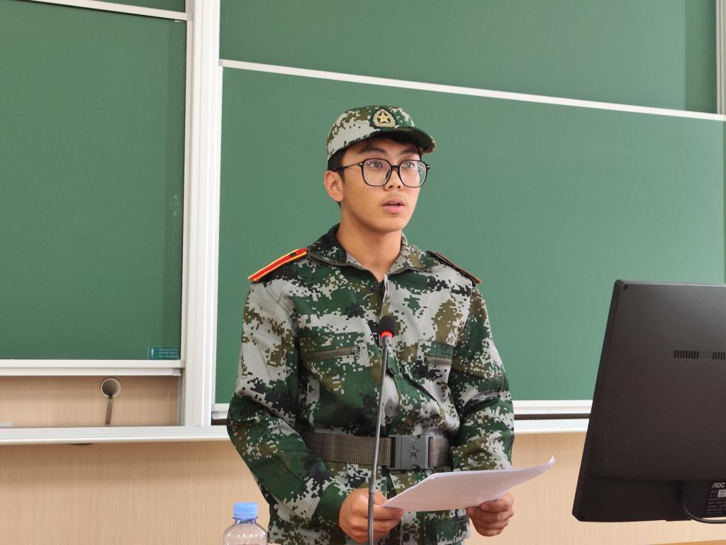 参训学生赵子强代表全体同学发言,他呼吁同学们要积极投身军训活动,发扬不怕吃苦、勇于挑战的斗争精神,锻炼自己,提升能力;要追求卓越、奋勇争先,具备不甘平庸的斗争精神;要团结一致、精诚合作,铸就荣辱与共的集体观念。