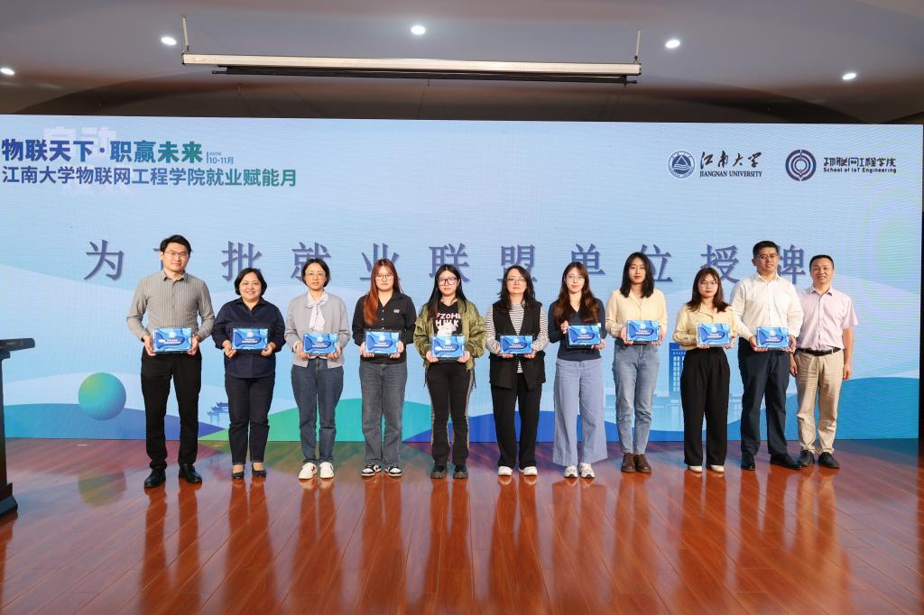 授牌仪式环节,耿向阳为无锡信捷电气股份有限公司、卡特彼勒(中国)投资有限公司、无锡先导智能装备股份有限公司等10家首批加入物联网工程学院就业联盟单位进行授牌。
