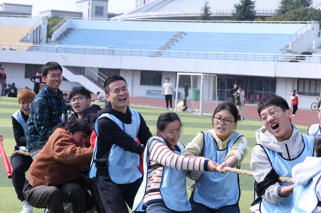 随后,激动人心的比赛正式开始。首先进行的是“同心同行”八人九足跑,相邻师生间双脚绑上绳子,团结协作,奋力向终点冲刺。他们互相鼓励,共同面对挑战,用实际行动诠释了合作就是力量的真谛。观众们也被这种团结协作的精神所感染,纷纷为选手们加油助威。在“众星捧月”花毽围踢项目中,每队五名成员围成圈相互传递踢毽,不仅考验个人技巧,更需要团队配合默契。选手们或踢或传,或跳跃或旋转,尽情展现运动风采。最后进行的是“凝心聚力”团体拔河比赛。各队选手齐心协力,为了团队的荣誉而奋力拼搏,展现了他们坚韧不拔和顽强拼搏的精神,现场观众们的加油声、呐喊声此起彼伏,为比赛增添了更多的紧张刺激与激情活力。