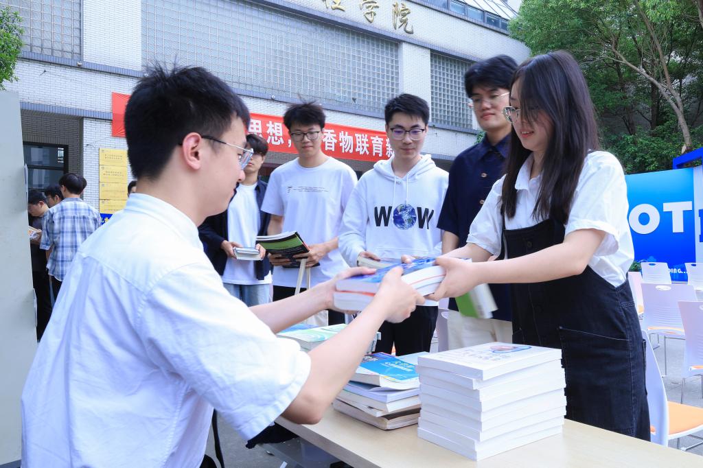 捐书活动现场,师生踊跃参与捐赠。名著小说、教材课本、大神笔记……一本本书籍上满是笔记与折痕,承载着一位位江南人的奋斗故事。每位捐赠图书的师生均获得了特别款捐赠证书和创意设计款“周书签”。书籍“捐”“领”活动将持续进行,书香氛围热烈。