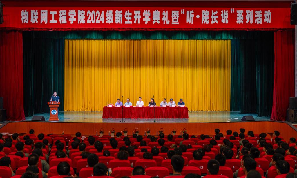 9月10日晚,物联网工程学院2024级新生开学典礼暨“听·院长说”系列活动在文浩馆观众厅隆重举行。学院党委书记张华,院长栾小丽,学院党委副书记、副院长孔丽丹,副院长陶洪峰、郭亚,自动化系主任吴定会,信息技术系主任吉训生,电气工程系副主任卢闻州及2024级本科新生班主任代表、系部教师代表、辅导员代表出席典礼,2024级全体研究生和本科新生参加活动。大会由孔丽丹主持。
