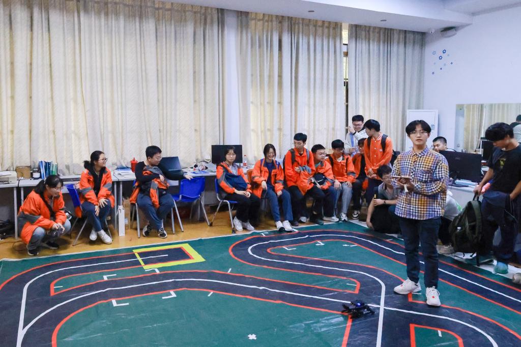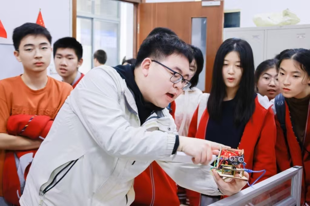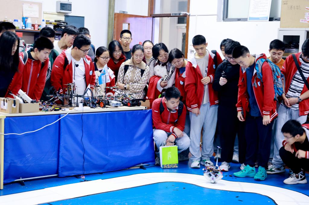 在智能车俱乐部,同学们时而认真揣摩两轮车、独轮车等科创作品的工作原理,时而惊喜于作品实现的自主运行、自动避障等奇妙功能,他们不仅像海绵一样汲取知识,更能围绕其中的科学原理踊跃发言。