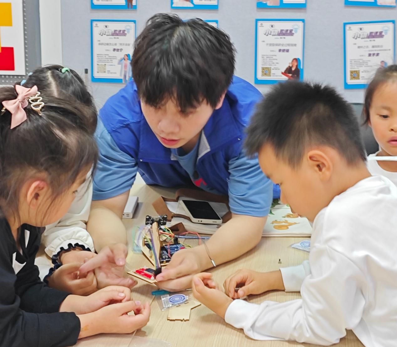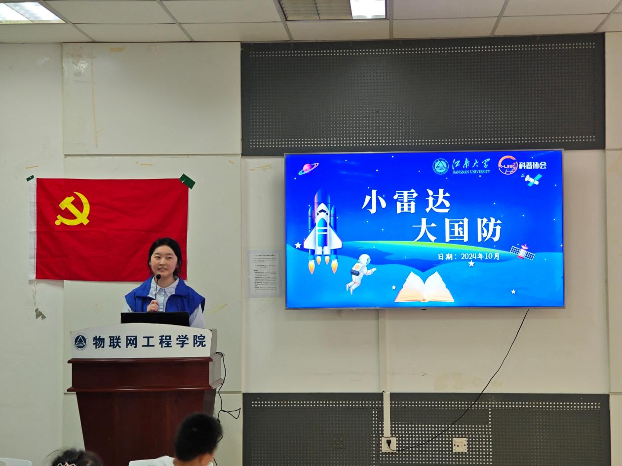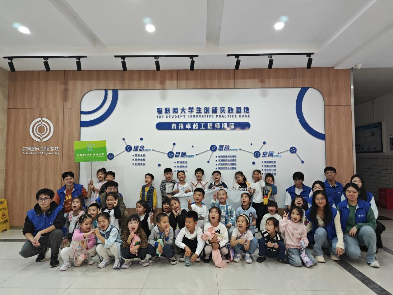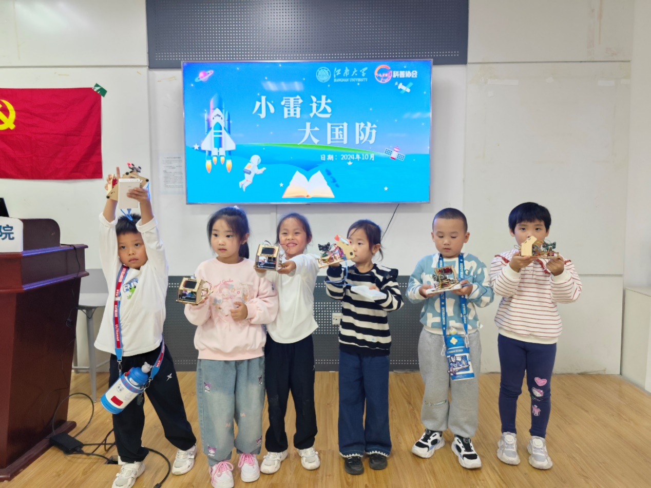 七曲桥进行签到和合影。随后,在大学生创新实践基地党支部党员的带领下,师生们参观了物联网工程学院大学生创新实践基地,了解了现代科技在国防、工业、生活等多个领域的应用。大学生创新实践基地党支部的党员们担任主讲与助教,为孩子们带来了一堂生动有趣的“小雷达 大国防”公益课程。课程从蝙蝠的回声定位讲起,逐步引导孩子们理解了雷达的工作原理,并通过动画片和趣味游戏的方式,让孩子们在轻松愉悦的氛围中掌握了雷达的构造和探测方法。