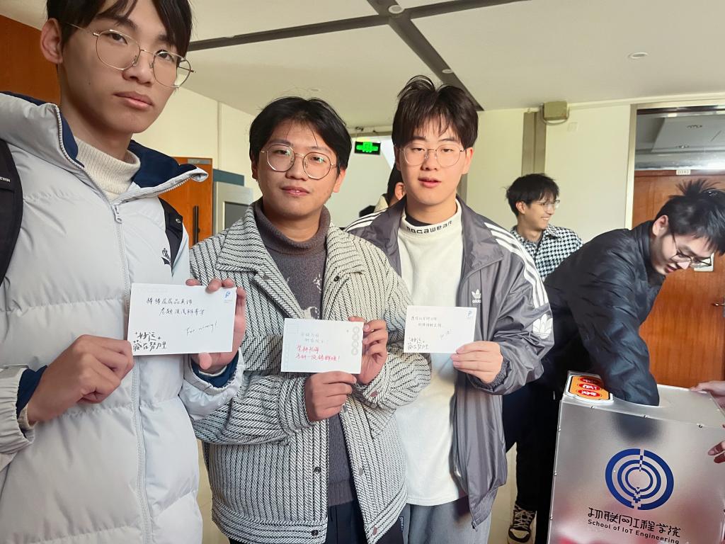 随后,学院党政领导同与会班主任、辅导员老师为考研学生代表送上学院精心准备的考研加油包,每个加油包中包含十件礼物,每一个礼物背后都有其独特的含义,都承载着学院对考研学子们的最深切的祝福和最温暖的慰问。物联心协在考研慰问会场前,举行了“逐梦研途,砥砺前行”心理健康教育小活动,通过抽取惊喜盲盒、兑换祝福卡片的趣味形式吸引大家驻足参与,在轻松愉悦的氛围中为学长学姐缓解考研焦虑、送上祝福和鼓励。